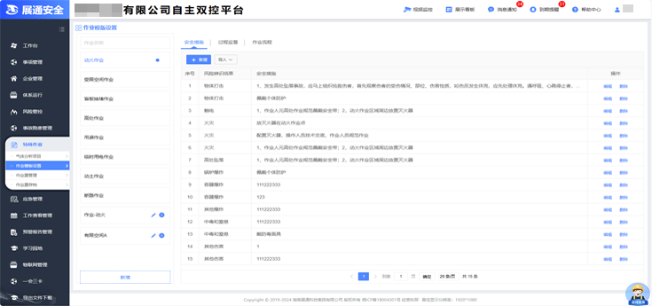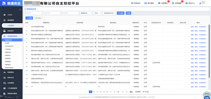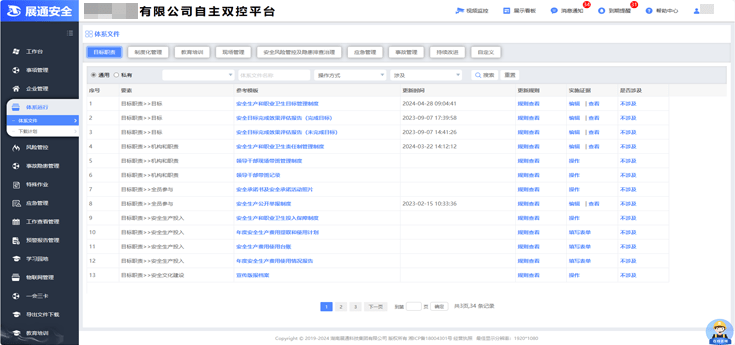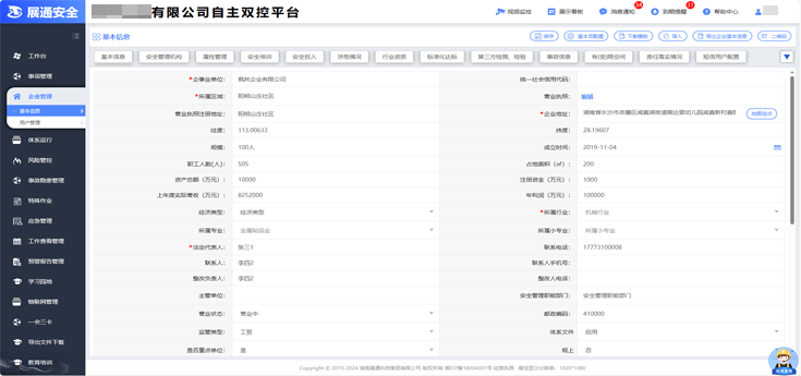 系統(tǒng)提供企業(yè)基本信息、安全管理架構(gòu)、安全投入、涉危情況、行業(yè)資質(zhì)、安全培訓(xùn)、職業(yè)衛(wèi)生、涉塵涉爆、有(受)限空間、第三方檢測、檢驗等15個功能模塊,可根據(jù)企業(yè)實(shí)際情況進(jìn)行選用。