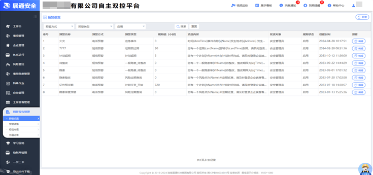 平臺提供隱患管理超期、證照(預(yù))超期、工作計劃實(shí)施、風(fēng)險定期巡檢、物聯(lián)感知、應(yīng)急事件等多方面的預(yù)警,依需設(shè)置預(yù)警規(guī)則,支持短信、電話、微信等多途徑消息推送,實(shí)時提醒相關(guān)責(zé)任人進(jìn)行處理;