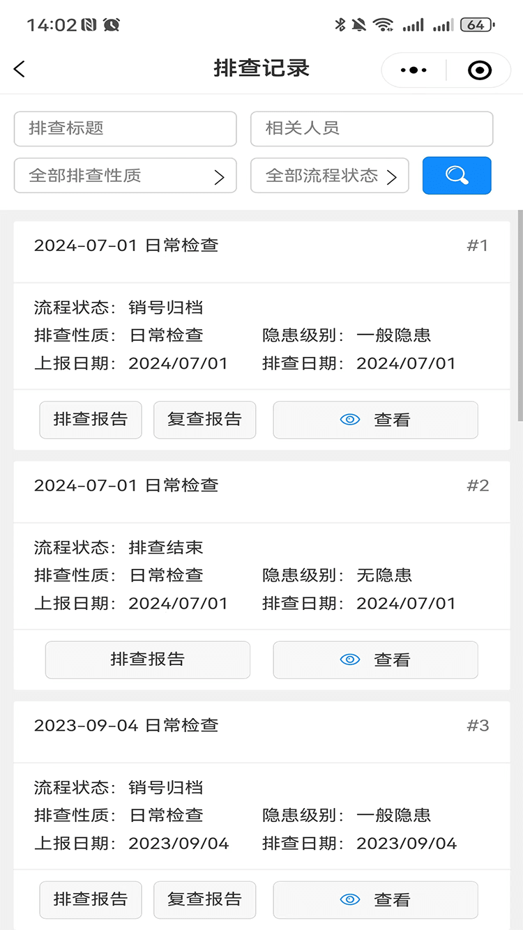 企業(yè)安全管理人員可依托檢查表庫、隱患數(shù)據(jù)庫或者自主新增,完成隱患的排查、上報、整改、復(fù)查、歸檔等一系列流程運(yùn)轉(zhuǎn),實(shí)現(xiàn)隱患閉環(huán)管理;根據(jù)隱患排查治理信息,自動生成安全檢查報告,支持線上打印及一鍵導(dǎo)出。