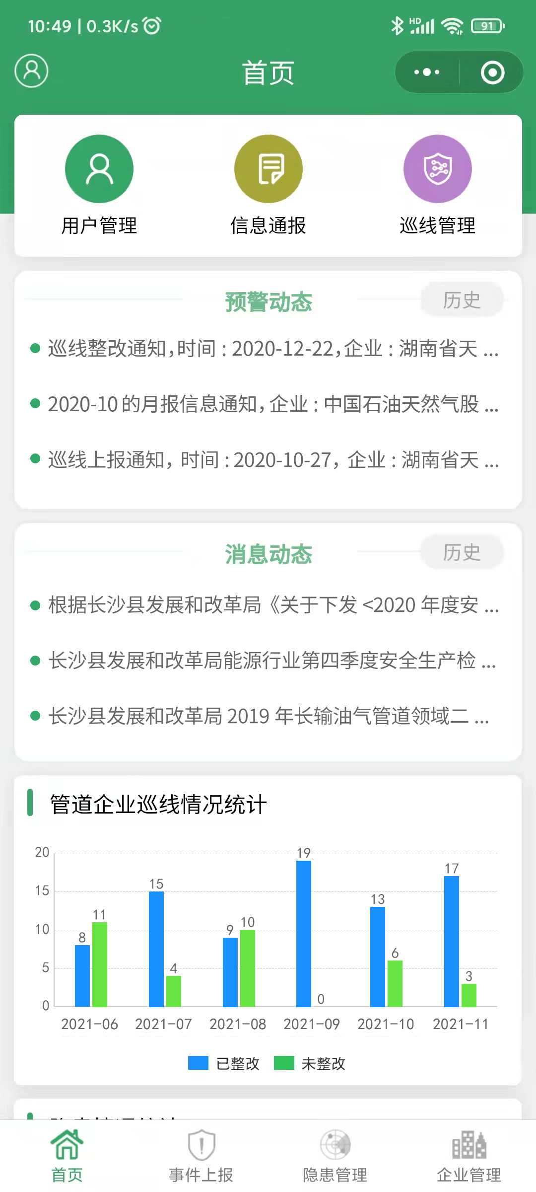 平臺配置了手機端小程序,安全監(jiān)管人員、鎮(zhèn)街人員、管道企業(yè)人員皆可通過小程序隨時開展日常管理工作,快速增強工作便利性,持續(xù)提升安全工作的信息化水平。